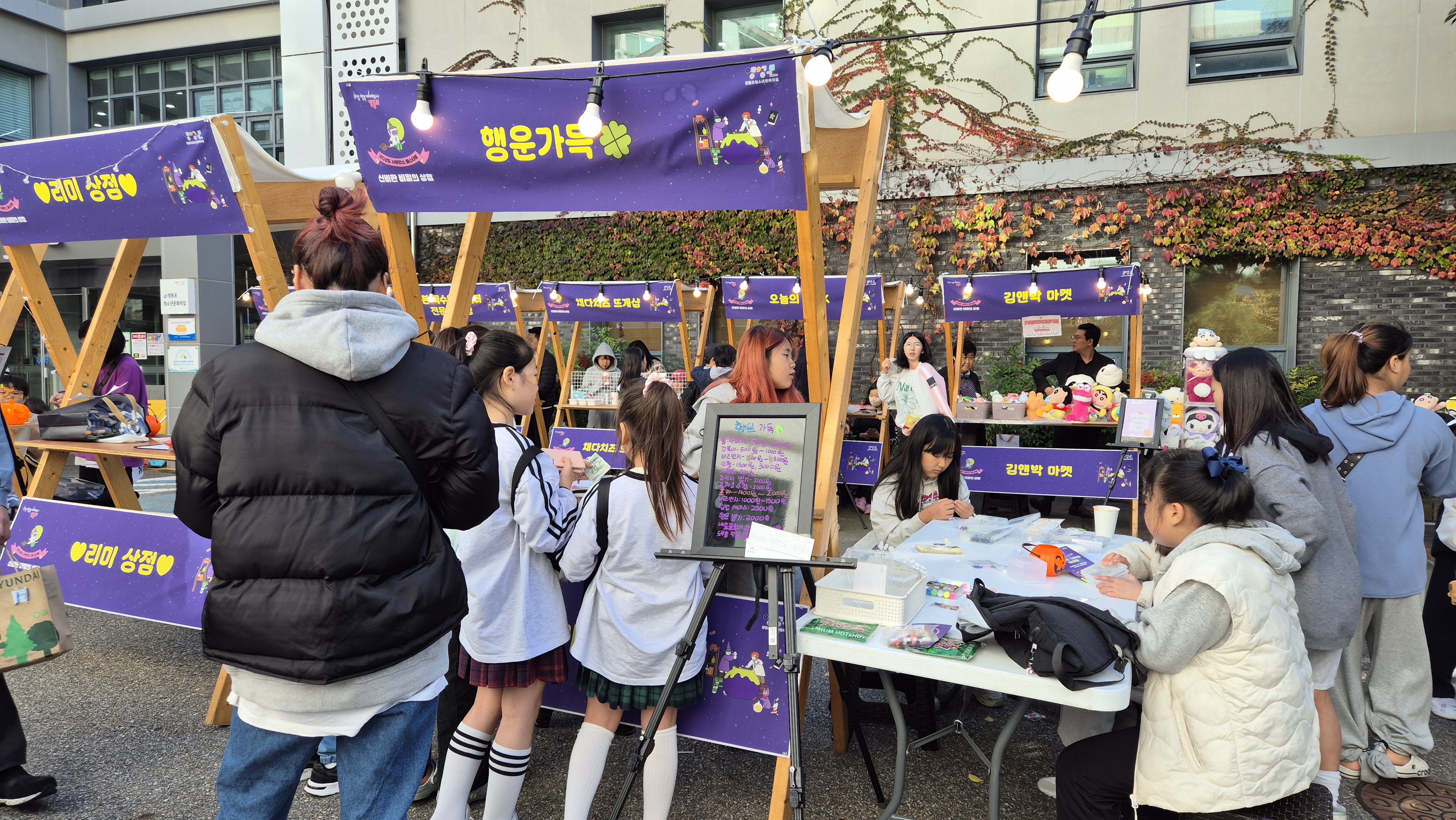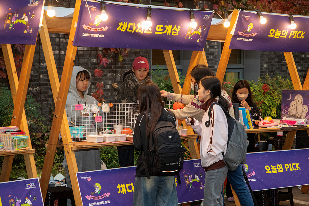 1층 주차장에서 열린 야시장 '신비한 비밀의 상점' 에서는 청소년들이 직접 셀러로 운영하는 11개의 부스를 설치하여 지역 주민과 방문객들에게 활기찬 분위기를 선사하며 큰 인기를 끌었는데요! 오니으니상점, 오늘의 PICK, 핸드&빈티지 마켓, 똥쥬네 옷장, 먹거리부스(떡볶이)등 다양한 부스가 운영되었으며, 캐리커쳐 및 페이스페인팅 등 전 세대가 함께 즐길 수 있는 이벤트도 마련되어 축제의 분위기를 풍성하게 하였습니다!
