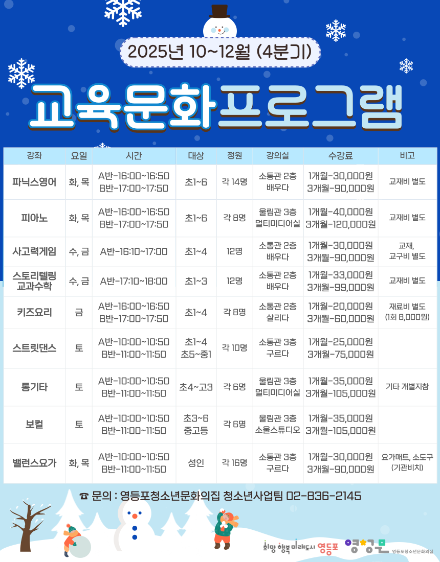 안녕하세요. 청소년들의 문화놀이터이자 온라인 학습의 숲, 영등포청소년문화의집(이하 ‘영청문’)의 프로그램을 신청해 주셔서 감사합니다.